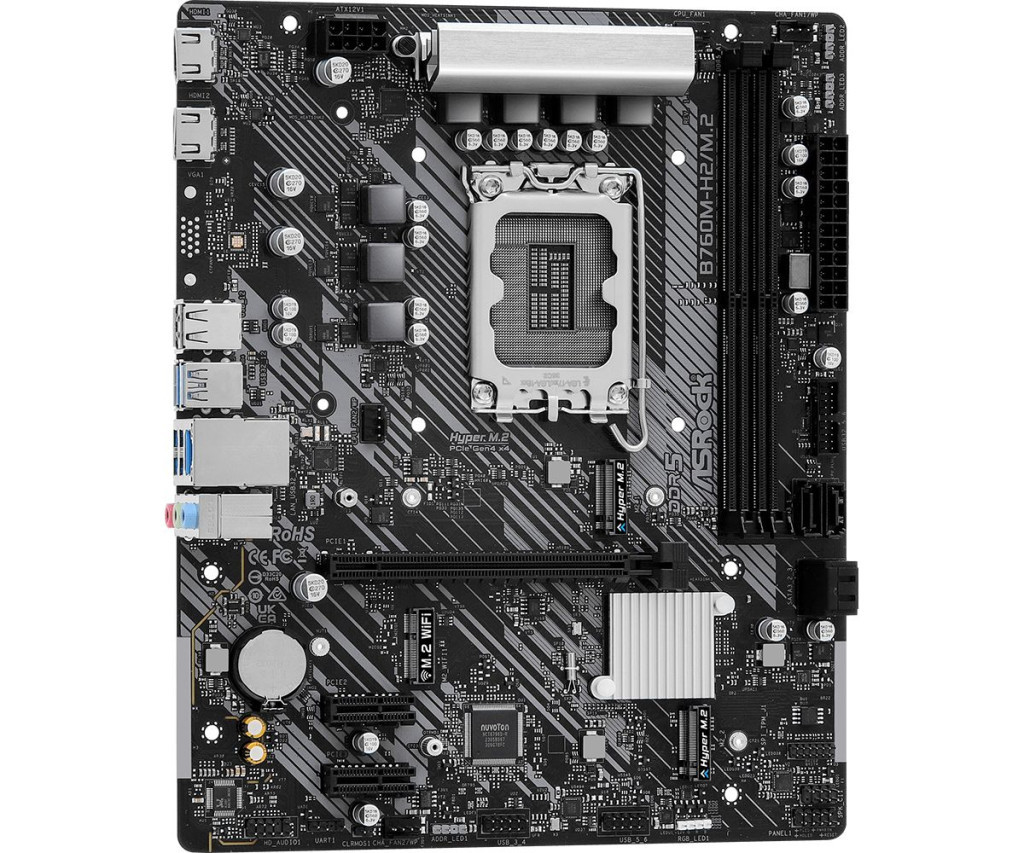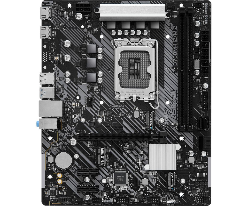 LGA1700, Intel B760, 2xDDR5, Max:5600MHz, Max:96GB, 1xPCIE16, 2xPCIE1, 4xSATA3, RAID, 2xUSB, 4xUSB3.2, HDMI, 7.1, 2.5Gb/s LAN, 2xHyper M.2, Micro-ATX