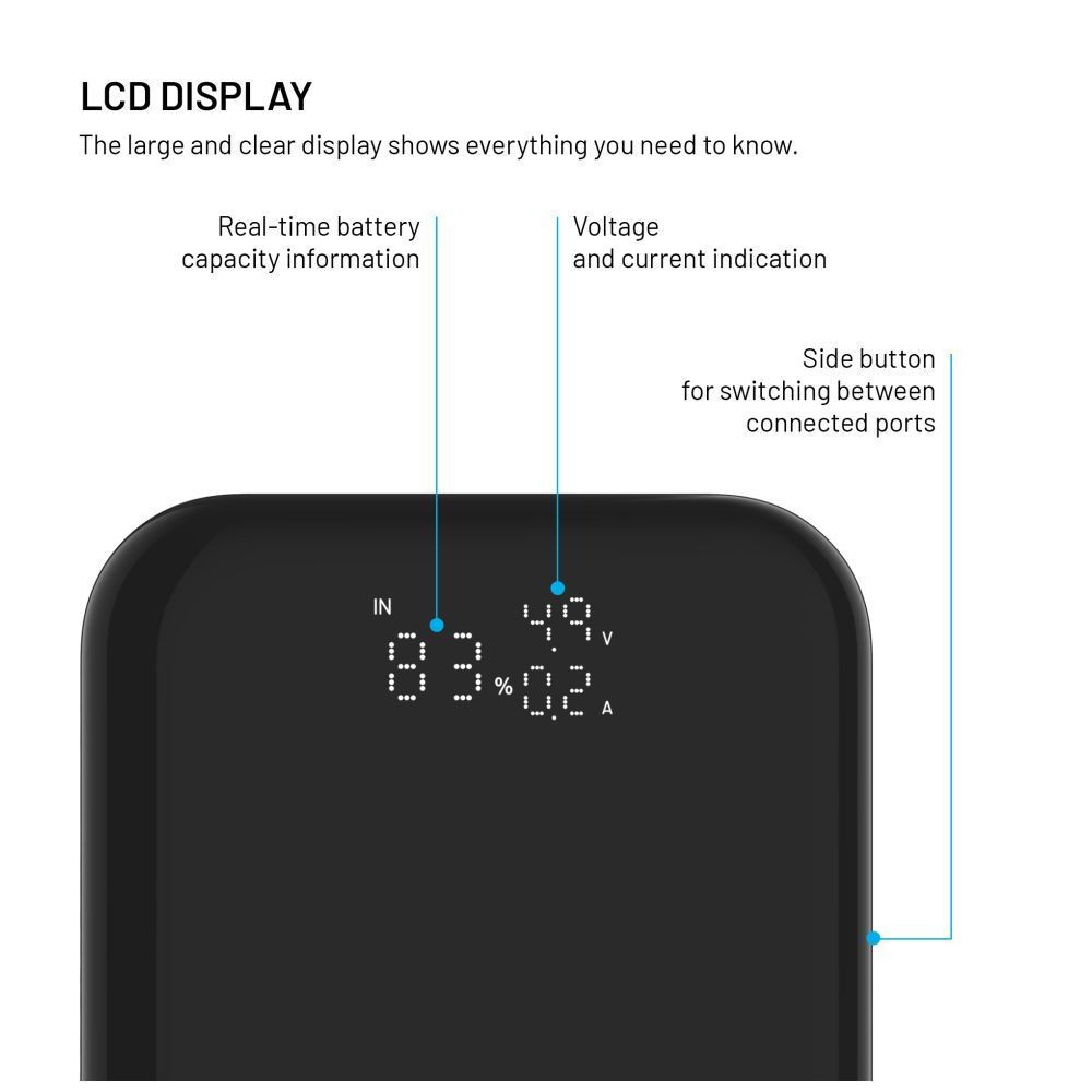 - LCD kijelző az akkumulátor százalékos értékével és az egyes portok teljesítményével