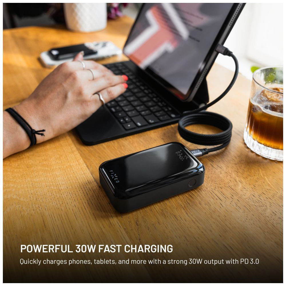 A kompakt Zen 10 Pro power bank akár 30 W-os gyorstöltést támogató Power Delivery 3.0 technológiával megbízható energiát biztosít telefonja, táblagépe és más USB-C eszközök töltéséhez. Az USB-C és USB-A portoknak köszönhetően két eszköz egyidejű töltését teszi lehetővé, így ideális a napközbeni vagy utazás közbeni folyamatos töltéshez. Az intelligens LCD-kijelző világosan mutatja az akkumulátor kapacitását és az egyes portok aktuális kimeneti teljesítményét külön-külön, így mindig áttekintheti a töltés előrehaladását. Maga a power bank egy akár 20 W teljesítményű USB-C porton keresztül tölthető a csomagban található USB-C/USB-C kábelen keresztül. Kompakt méreteinek és kis súlyának köszönhetően a FIXED Zen 10 Pro power bank könnyedén elfér bármelyik kézitáskában vagy hátizsákban. Ezért ideális útitárs, amely bárhol és bármikor áramot biztosít eszközeidnek.