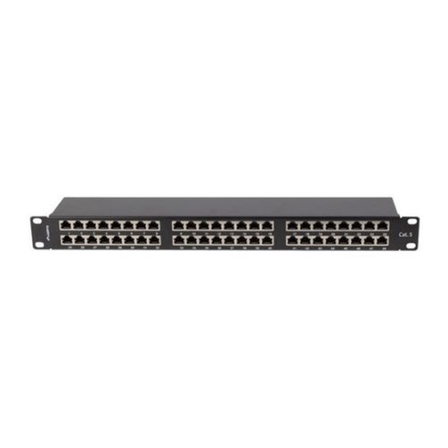 Patchpanel mit 48 Ports für CAT.5e Verkabelung in schwarzem Design.