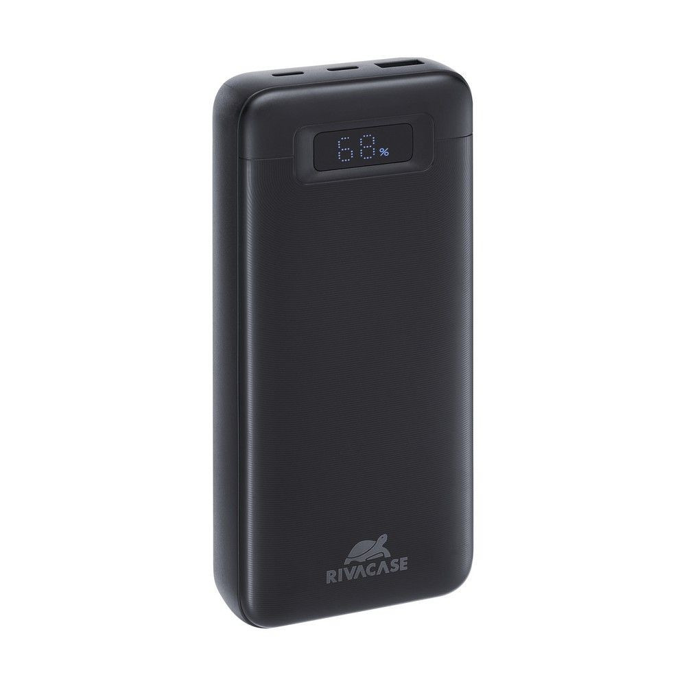 Hochleistungs-Powerbank von RivaCase mit 65W Leistung und 20000mAh Kapazität in Schwarz.